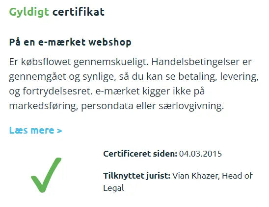 Certificeringsordningen er den mest anerkendte for e-handel i Danmark, og mærket er din garanti for en sikker, gennemskuelig og tryg handel. Det betyder også, at du som forbruger har en køberbeskyttelse på op til 10.000 kr. pr. handel, og at vi som indehavere af mærket løbende bliver kontrolleret af jurister fra e-mærket.